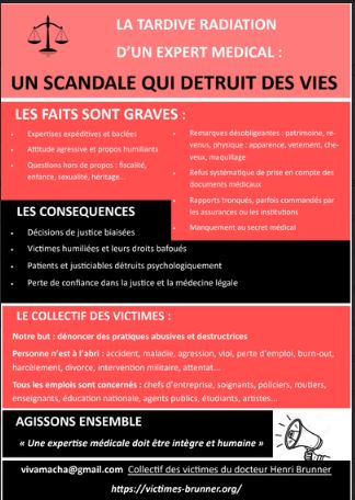 Aujourd’hui pour des raisons de possibles conflit d’intérêt, nous demandons aux instances judiciaires, aux assurances, aux institutions ou autres employeurs de ne pas adresser les dossiers aux soutiens de Dr Brunner, pour que la victime puisse bénéficier d’une étude sereine, impartiale et sans lien avec Dr Brunner.